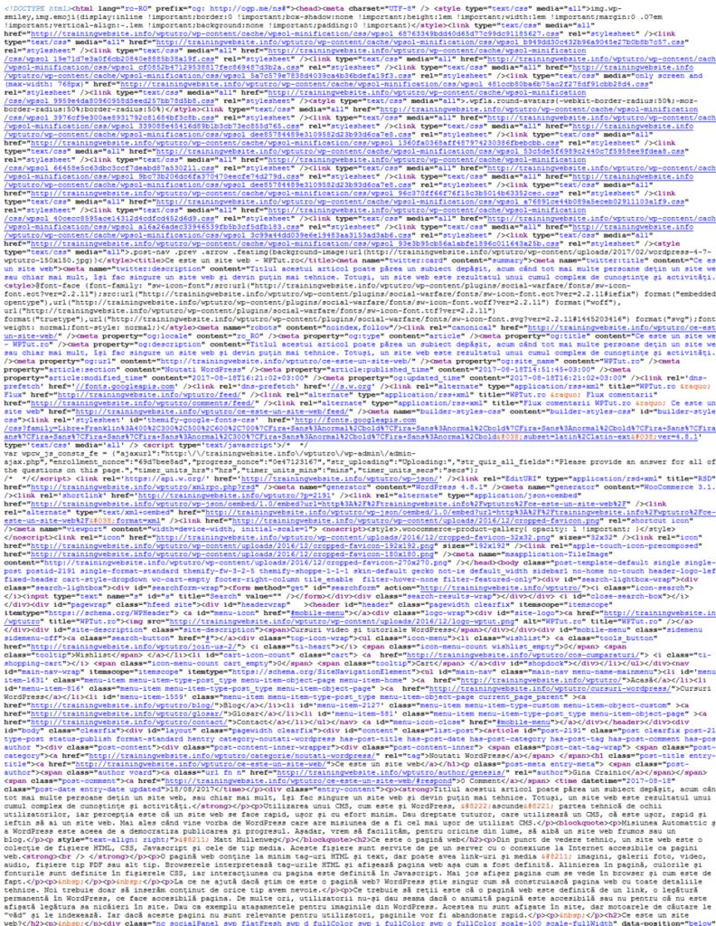 O pagină web conține tag-uri HTML – limbajul web-ului – și text, dar poate avea și fișiere media – imagini, video, audio, fișiere tip PDF sau alt tip. Browserele interpretează tag-urile HTML și afișează pagina web așa cum a fost definită. Alinierea în pagină, culorile și fonturile sunt definite în fișierele CSS, iar interacțiunea cu pagina este definită în Javascript. Mai jos afișez pagina, pe care te afli, așa cum se vede în browser și cum este de fapt.