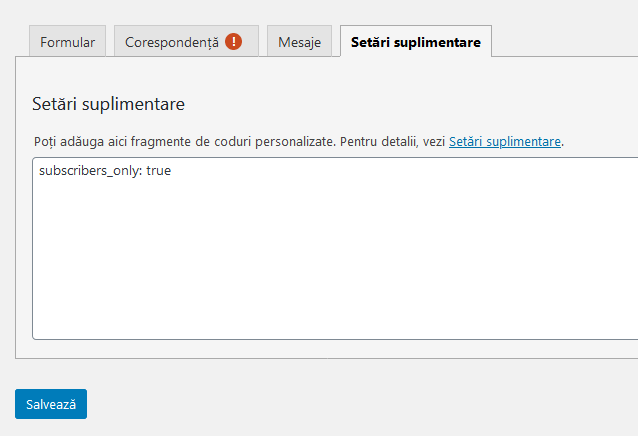 Ultimul tab – Setări suplimentare, este utilizat pentru a insera diferite fragmente de cod cu diverse acțiuni. În imaginea de mai jos am introdus un fragment de cod ce permite ca numai utilizatorii care au un cont pe site și sunt autentificați, să poată completa formularul.