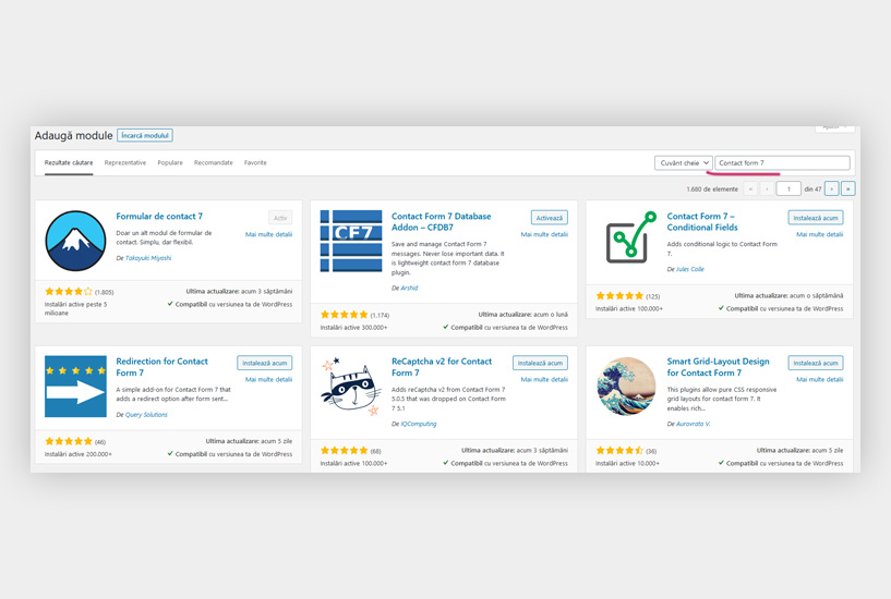 Instalarea se face din Module -> Adaugă modul [en.Plugins->Add New] , ca orice plugin WordPress. Apoi în căsuța de căutare module introduci Contact form 7.