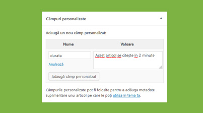 Acest tip de informație se numește meta-data și este formată din perechi cheie-valoare. De exemplu, dacă vrei să ai textul ”Acest articol se citește în 2 minute”, inserat în partea de sus a articolului, atunci creezi un câmp personalizat.