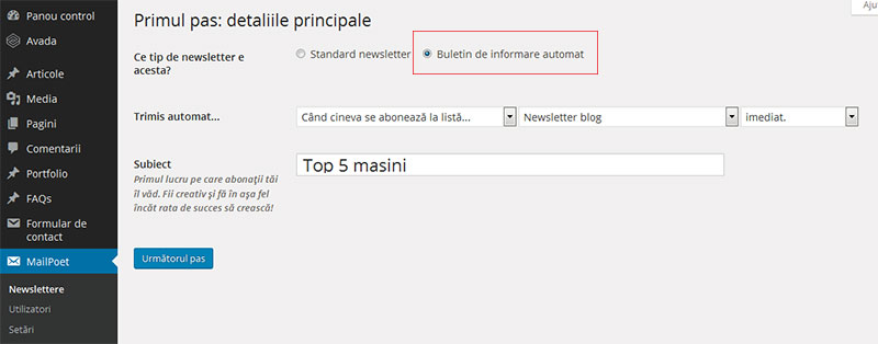 Chiar daca singurul abonat esti deocamdata doar tu, creeaza si primul newsletter. Din meniul MailPoet->Newsletter da click pe butonul de sus – Creeaza un nou email.