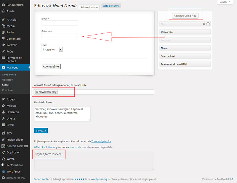 Formularul se creează din MailPoet->Setari, tab-ul al doilea – Formulare. Dă click pe Creează o nouă formă și se va deschide o fereastră cu un formular ce conține câmpul Email și butonul de Abonare. Dacă dorești să ai în formular Nume și Prenume, trage-le cu mouse-ul din dreapta direct în formular.