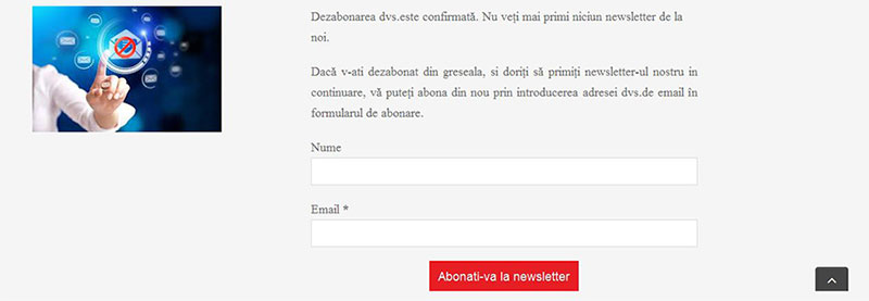 Pagina de Dezabonare poate avea și un formular de abonare pe lângă mesajul în care asiguri abonatul că nu va mai primi newsletter. Am observat de-a lungul timpului că unele persoane se dezabonează din greșeală. Nu este obligatoriu să pui un formular suplimentar, ți-am dat doar o idee.