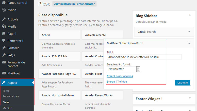Formularul poate fi plasat oriunde in site ca shortcode sau ca widget in bara laterala sau in subsolul paginii. Din meniul WordPress alege Aspect->Piese si o sa vezi widget-ul MailPoet Subscription Form. Trage-l in locatia dorita de tine, modifica titlul daca e nevoie, alege un formular si salveaza. Acum ai un formular in bara laterala, iar vizitatorii se pot abona la newsletter-ul tau.